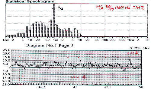 顯然圖中λ1“山狀”波及其諧波明顯減弱幾近消失,這說明λ1確系近周期機械波。λ2“山狀”波源自頭針故仍呈現,其前羅拉(Φ67)部位的機械故障與二針類同。現因二針的牽伸倍數減小,故λ2≈90cm也相應縮短,λ2(計算)≈π×6.7×4.4≈92cm。