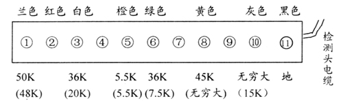 5 對于微處理器明顯燒壞的故障,換新板時,需對控制范圍內的檢測頭逐個作電阻檢查,找出短路的檢測頭是否會再次燒壞新的處理器。可在萬用表電阻擋用紅表筆或黑表筆接地,檢測正常電阻數據(如圖,括號內數據為紅表筆接地)。